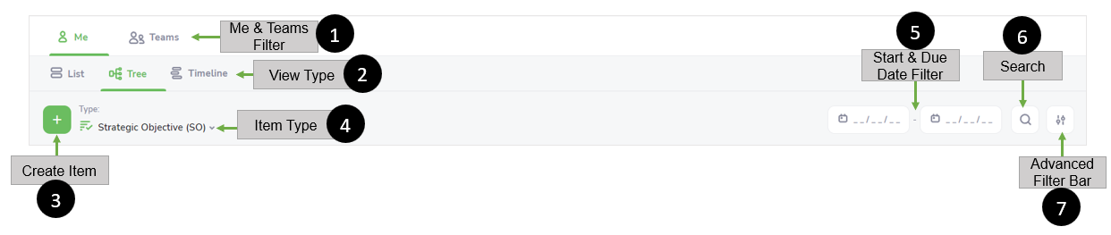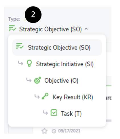 - Item Type Filter. Click this filter lets you display a view showing a particular item type (Strategic Objective (SO), Strategic Initiative (SI), Objective (O), Key Result (KR), and Task (T)).