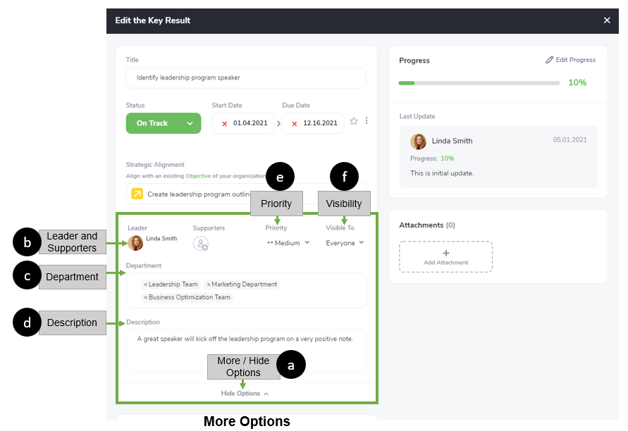 - More / Hide Options. This feature allows you to edit the following items: Leaders and Supporters, Priority, Visibility, and Department. You can also add a Description to provide more information about your work item. (Click