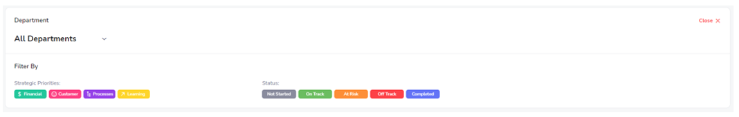 - Advanced Filter Bar. This item allows you to see the Strategic Priorities and Status Filter in one view. You can select or deselect any item to expand or narrow your view.