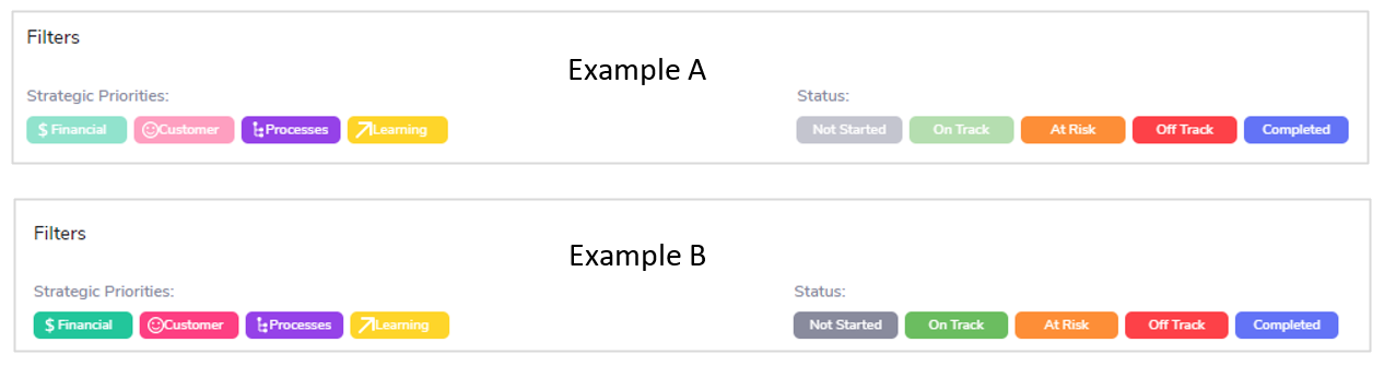 - Example A shows Strategic PrioritiesFinancial and Customer, and Status Not Started and On Track have been deselected, and they are muted. These items will not be displayed. By contrast, Example B shows all choices selected. As a result, all Strategic Priorities and Statuses will be displayed.